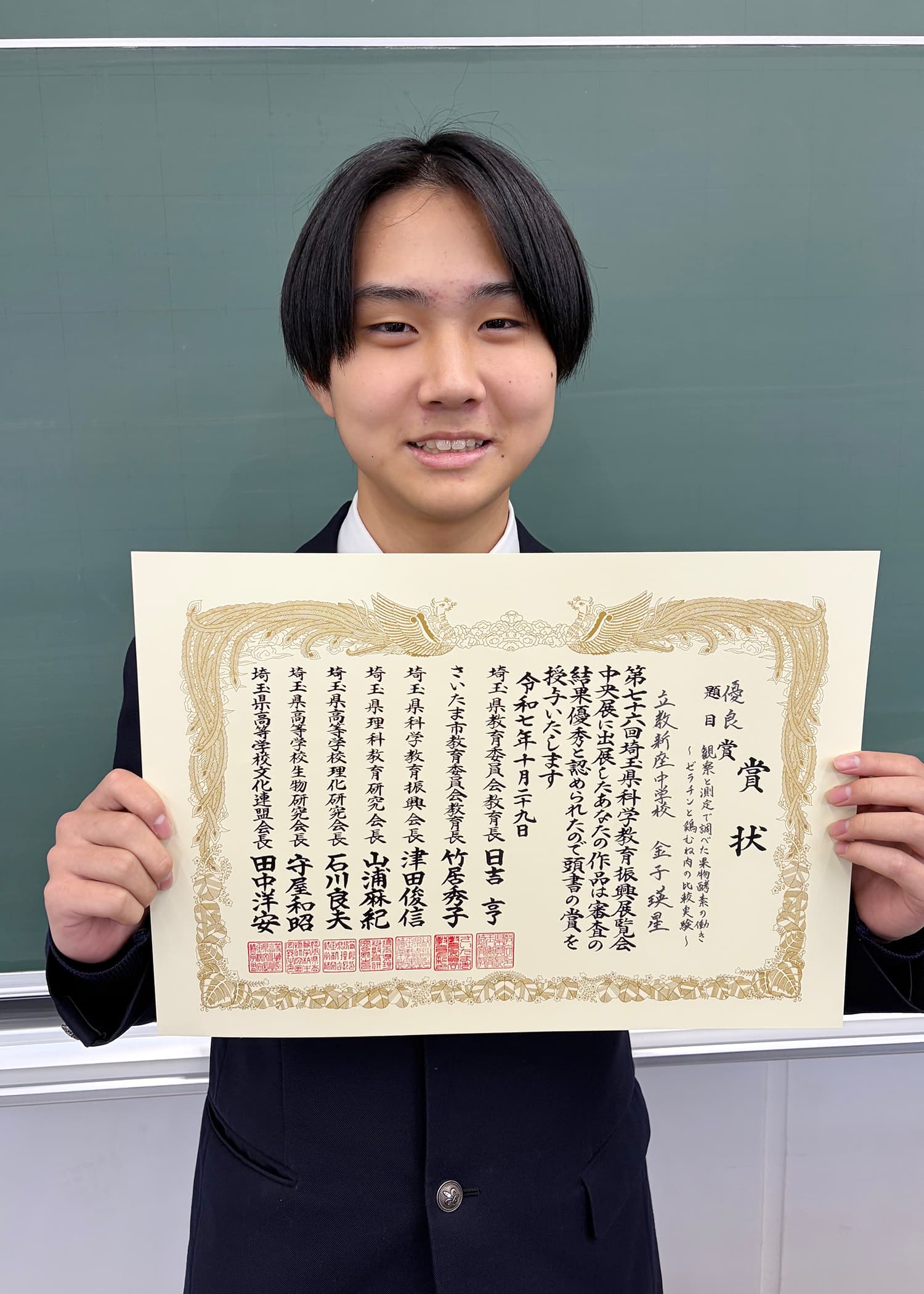 また、中学2年生 金子瑛星さんの自由研究「観察と測定で調べた果物酵素の働き~ゼラチンと鶏むね肉の比較実験~」は、「第76回 埼玉県科学教育振興展覧会/第69回 日本学生科学賞埼玉地区展覧会」で優良賞を受賞しました。