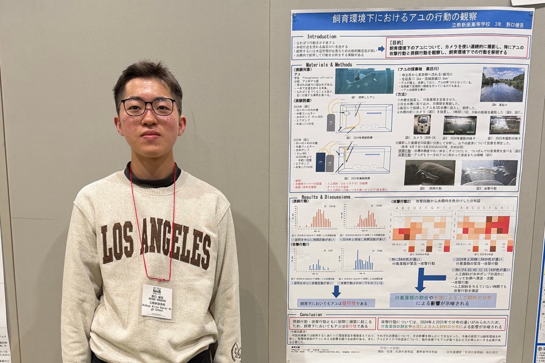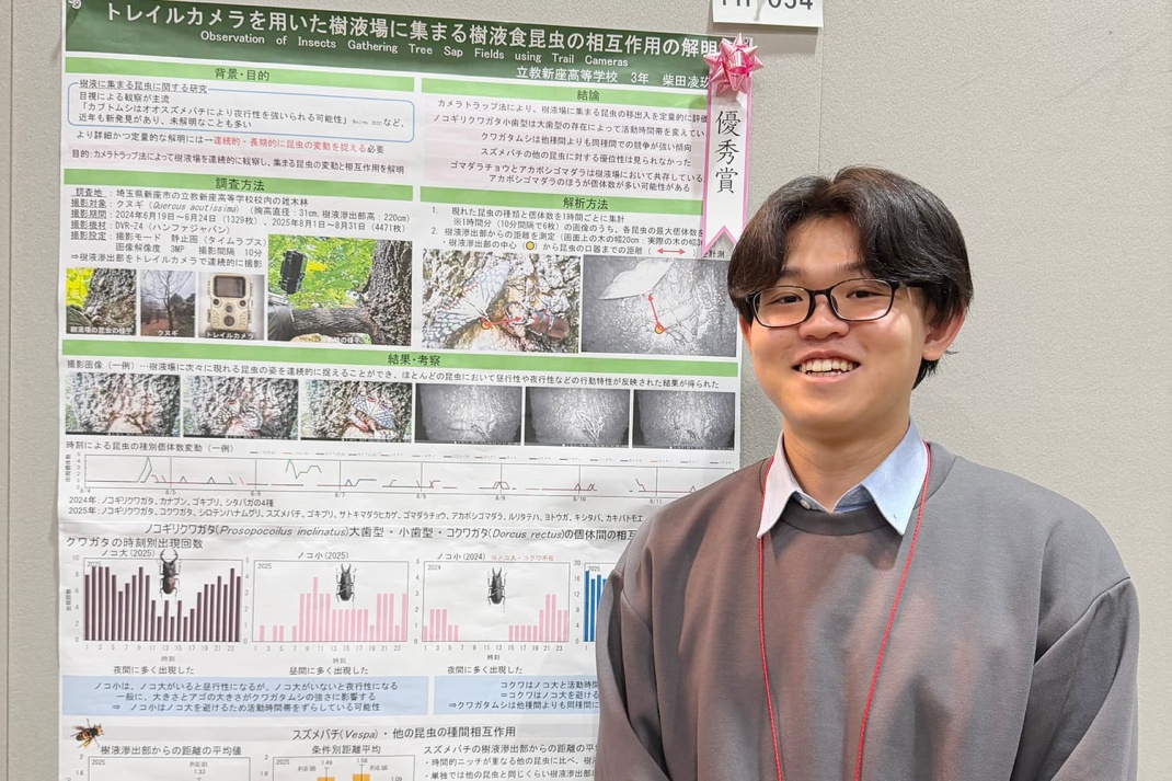 生物部の高校生3名が、第73回日本生態学会大会(3月11日〜15日@京都大学および国立京都国際会館)ジュニアポスター発表部門に参加し、柴田凌玖さん(3年※)が優秀賞を受賞しました。
